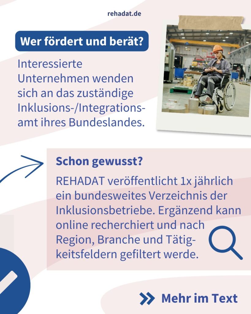 REHADAT ist das zentrale unabhängige Informationsangebot zur beruflichen Teilhabe und Inklusion von Menschen mit Behinderungen. Die Informationen richten sich an Betroffene und alle, die sich für ihre berufliche Teilhabe einsetzen. Alle Angebote sind barrierefrei und kostenlos zugänglich. REHADAT ist ein Projekt des Instituts der deutschen Wirtschaft Köln e.V., gefördert vom Bundesministerium für Arbeit und Soziales (BMAS) aus dem Ausgleichsfonds.